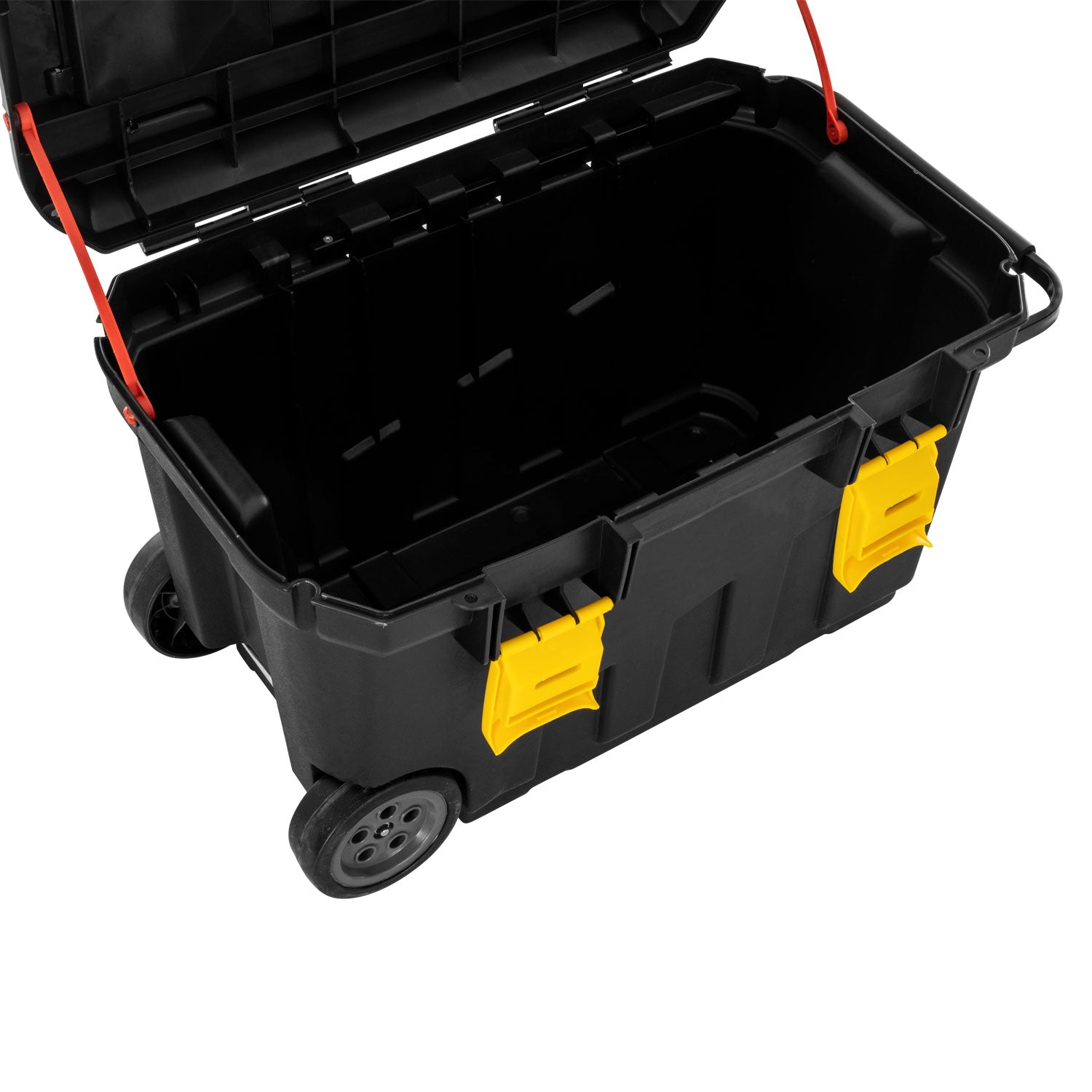 Grand coffre de voyage porte-selle avec roues et couvercle porte-objets Dimensions : H 49 x L 75 x P 48 Taille : Unique Couleur : Noir/Rouge Dimensions intérieures : 70x37 h 43,5 Sous-couvercle : 4cm